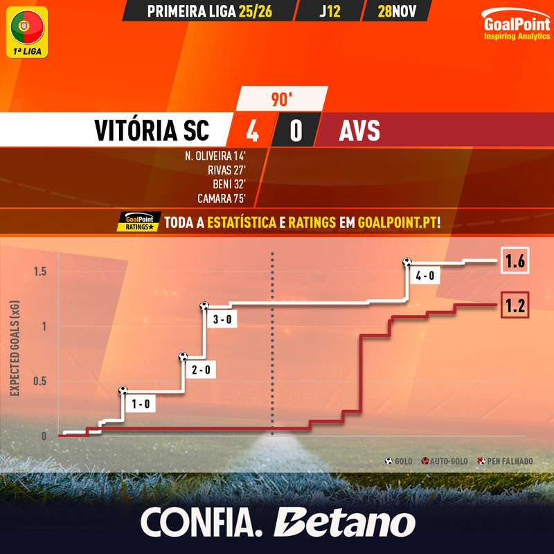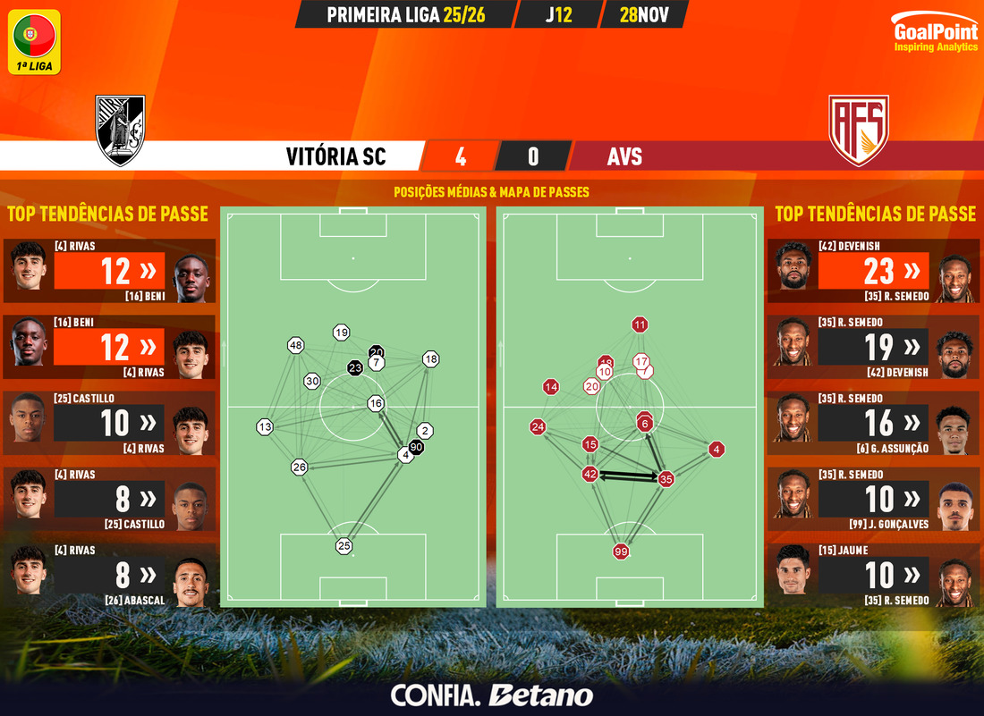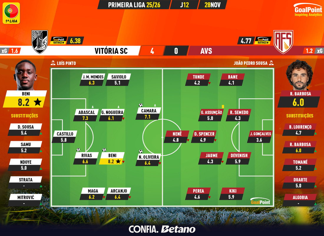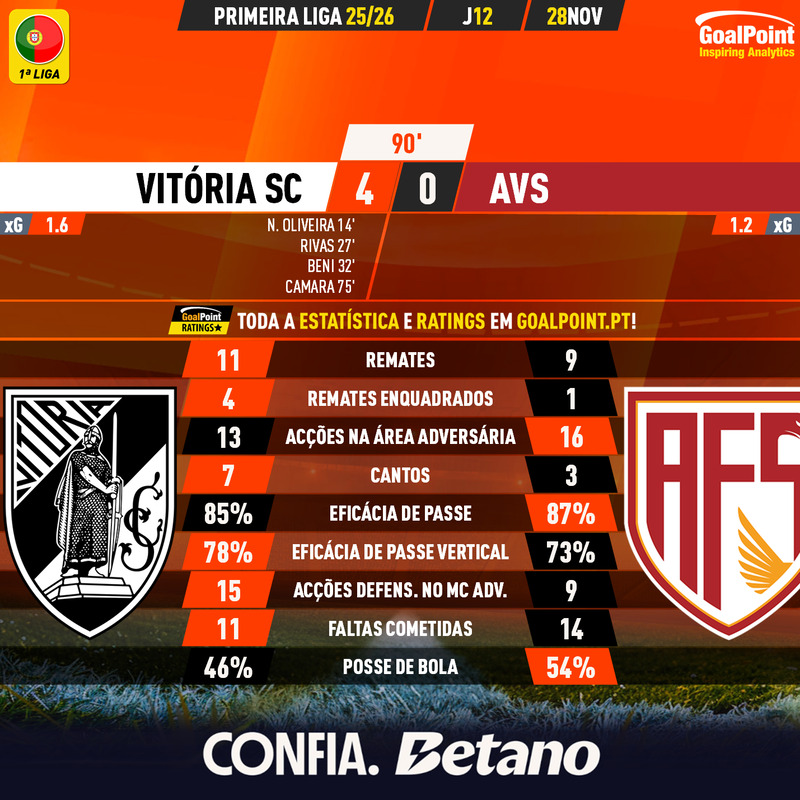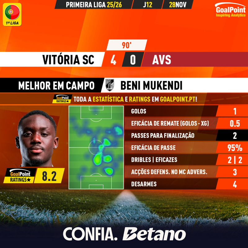 O Vitória SC entrou fortíssimo e construiu a vitória ainda na primeira parte, guardando um golo para o segundo tempo, apesar da reacção do AVS. Beni Mukendi (MVP, 8.1) marcou, jogou, fez jogar e não deixou jogar o adversário, mostrando-se o melhor em campo nos 79 minutos em campo.