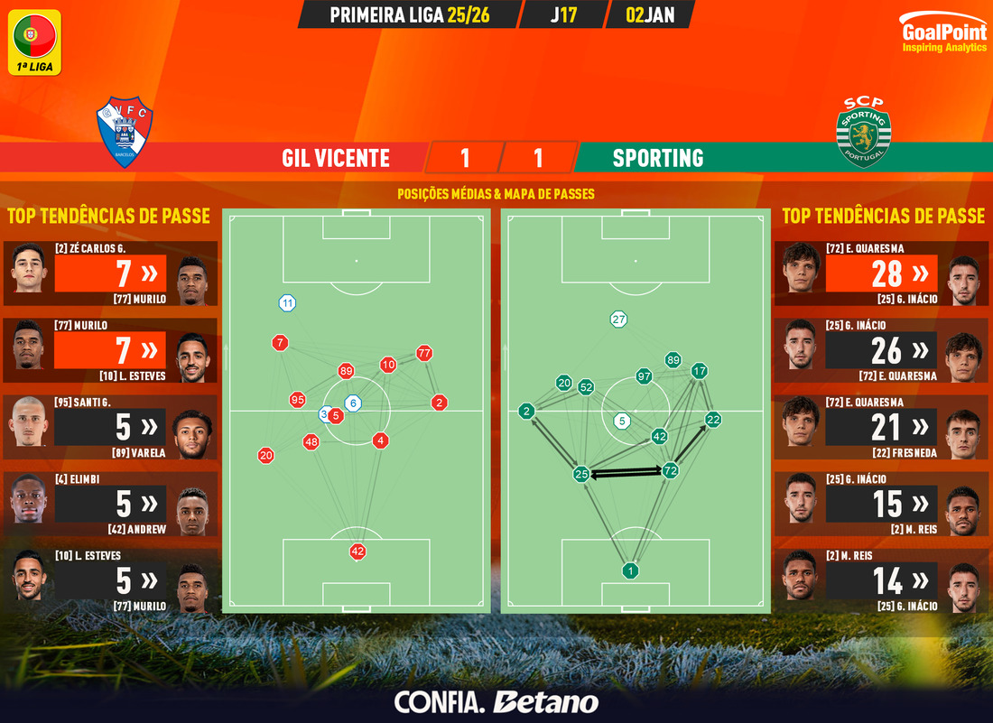 O Sporting entrou em 2026 com o pé esquerdo. Os campeões nacionais visitaram o Gil Vicente e empataram 1-1, deixando dois pontos no Minho. Numa partida na qual os homens de Barcelos remataram mais e criaram bastante perigo, em especial na segunda metade da etapa complementar, os de Alvalade marcaram primeiro, em cima do intervalo, pelo inevitável Luis Suárez, após uma deliciosa assistência do MVP da partida, Eduardo Quaresma. Contudo, o Gil entrou forte no segundo tempo e pressionou bastante, em especial em lances de bola parada (seis ocasiões desta forma), beneficiando da expulsão de Gonçalo Inácio em cima do minuto 79. Aos 87, Carlos Eduardo Saltou mais alto que todos e cabeceou para o empate final. Pelo caminho, os “galos” estabeleceram o seu máximo de remates enquadrados (9) e igualaram de passe/cruzamento (10).