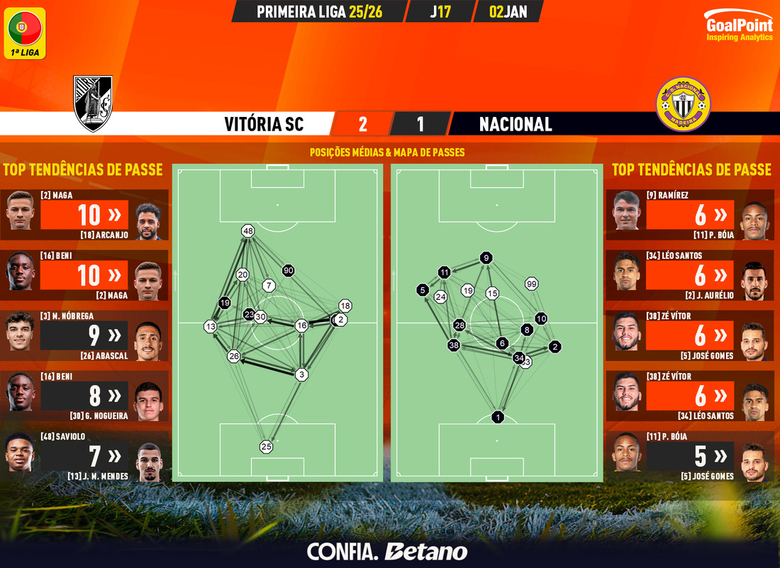 O Vitória SC regressou às vitórias, batendo o Nacional por 2-1, num jogo muito disputado e no qual os insulares acabaram por criar mais perigo (xG), mas nada puderam fazer para travar a inspiração de Noah Saviolo. O extremo belga marcou um golo, fez uma assistência em cinco passes para finalização e galgou muitos metros em condução com a bola (205 ganhos).