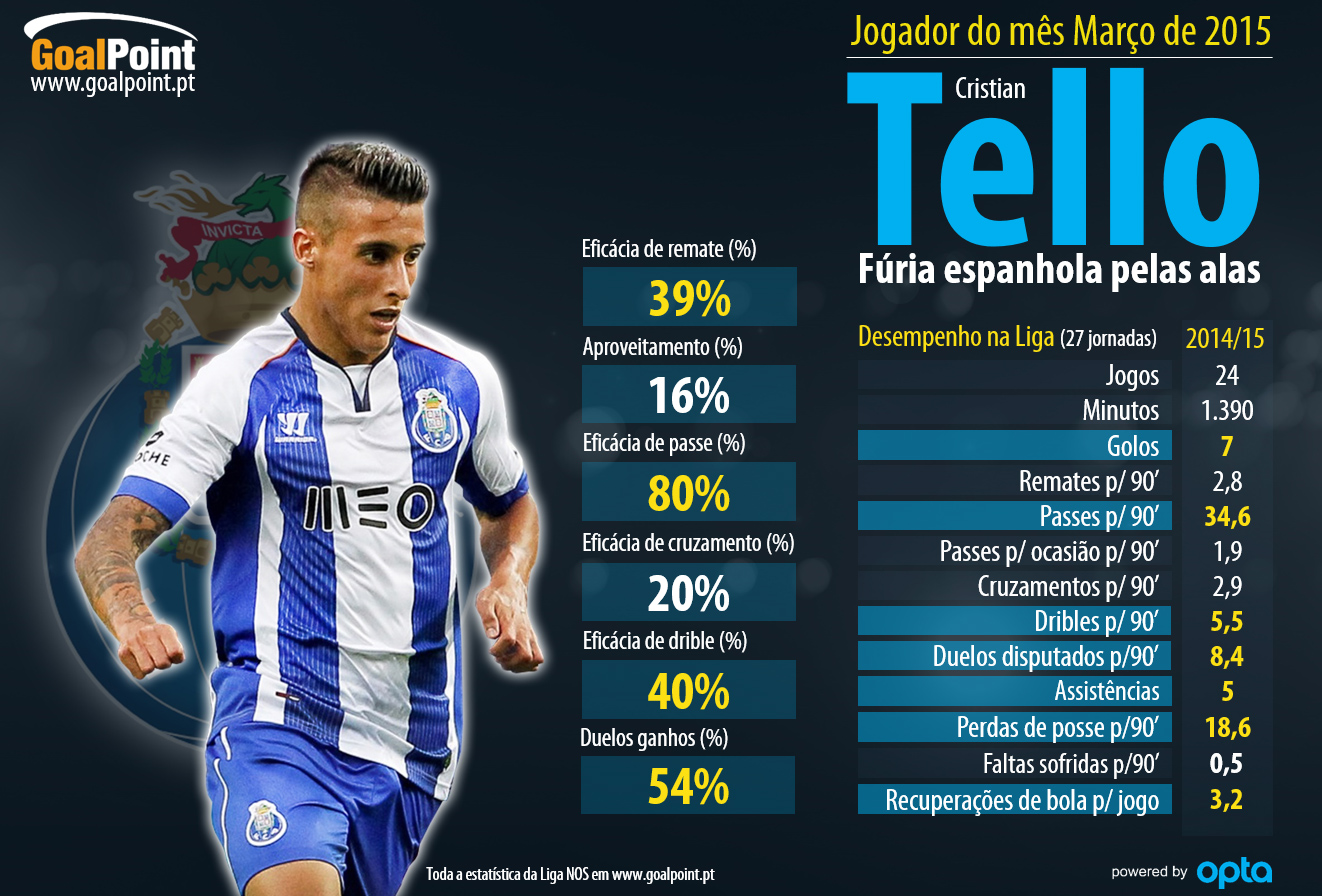Os números do espanhol em Março eclipsam os de todos estes outros jogadores que referimos. Em quatro jogos em Março, Tello marcou cinco golos e, a par de Lima, teve uma média de 3,3 remates por partida, 1,5 por jogo tiveram a direcção certa (correspondente a apreciáveis 46,2% de eficácia) e um aproveitamento em golo de 38,5%. E destes cinco nomes foi o que fez mais passes para ocasião por encontro (1,8). Podemos olhar para estes valores e considerá-los bons, mas se tivermos em conta que dois dos jogos foram contra Sporting e Braga, e que Tello marcou todos os golos portistas destas duas vitórias (“hat-trick” contra o “leão”), não será preciso argumentar muito mais para se perceber por que motivo o espanhol foi a grande figura do mês de Março.