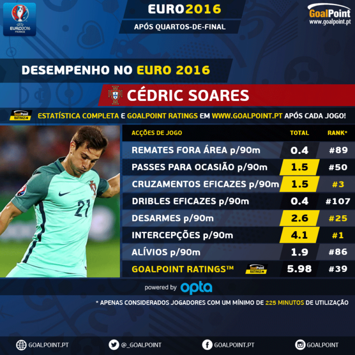 Começou no banco, a ver Vieirinha jogar, para assumir a lateral-direita nos últimos jogos. Ligado pela negativa ao golo polaco manda a justiça reconhecer que o desempenho de Cédric tem sido quantitativamente muito positivo: é o jogador com melhor média de passes interceptados do Euro 2016 e vai revelando uma eficácia de cruzamento atípica entre os colegas (Portugal tem cruzado muito mas com pouco acerto).
