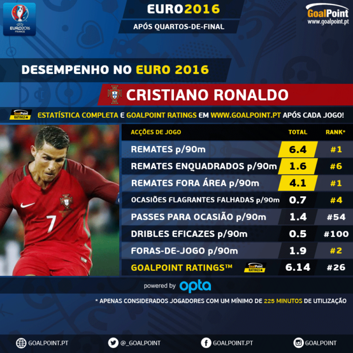 Ronaldo pode não estar a rubricar um Euro ao nível do que mostra habitualmente no Real Madrid mas… será isso tão surpreendente? Verifiquem-se ou não limitações físicas ou atravesse o capitão um momento de forma mais ou menos fulgurante. a verdade é que Cristiano é o mais rematador do Euro, o que indicia vontade de resolver.