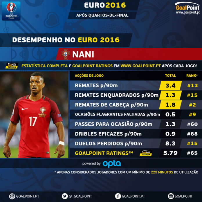 É curioso aliás perceber que é de cabeça que Nani mais se destaca, sendo o segundo jogador que mais remata dessa forma, no torneio, algo no mínimo… inesperado. E a verdade é que, não tivessem os guarda-redes (e os postes) adversários travado os seus ímpetos e Nani podia totalizar bem mais do que os dois (importantes) golos que soma.