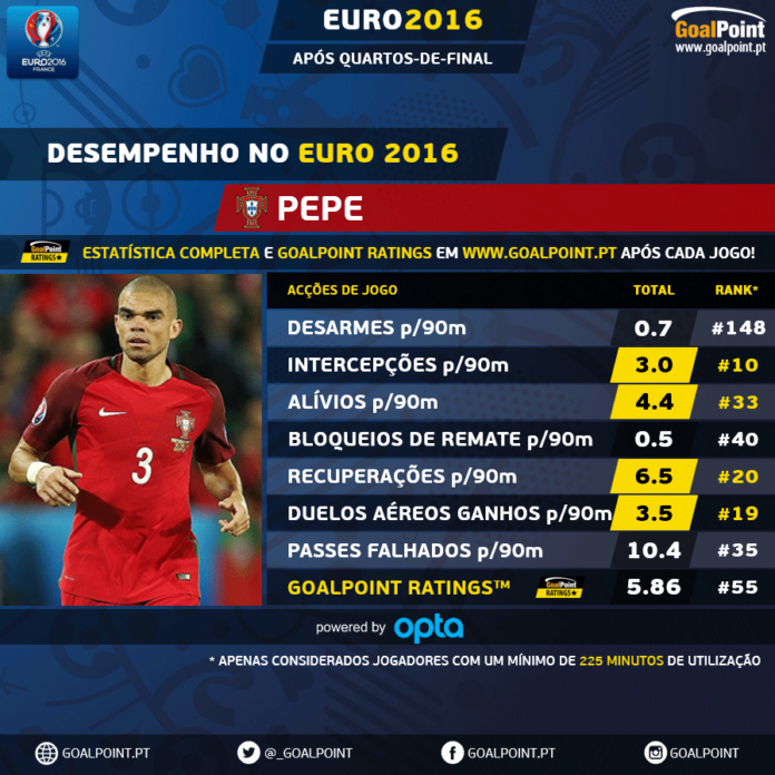 Centralão. É assim que tem sido visto Pepe neste Euro, por oposição ao papel que assumiu no já esquecido Mundial 2014. Pepe apresenta números fantásticos em quase tudo o que, defensivamente, se exige a um central, com particular destaque para as intercepções, onde se situa como o 10º jogador mais produtivo do Euro 2016.