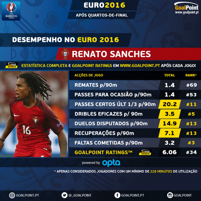 À falta de tempo para uma análise exaustiva de todos os “patrícios” que já pisaram a relva em França, centramos a nossa análise em cinco nomes que, pelos números e até a “olho”, vão sendo dados como influentes ou bem lançados no “onze” de Fernando Santos, complementando os seus números com a indicação do seu ranking, entre todos os jogadores que participaram no torneio (com um mínimo de 225 minutos disputados).