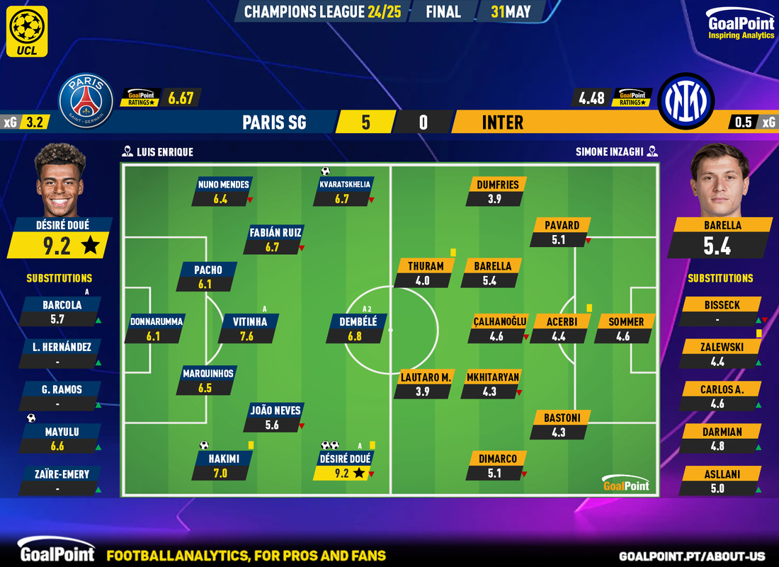 Que jogo tremando do jovem extremo de 19 anos. Désiré Doué destruiu o Inter com dois golos repletos de calma e classe. O francês, que saiu aos 67 minutos, enquadrou três de quatro remates, fez ainda uma assistência, criou duas ocasiões flagrantes em três passes para finalização e provocou o pânico constante na retaguarda italiana..