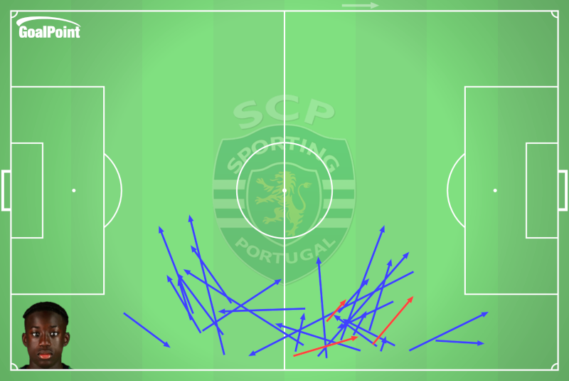 Os golos? Dois remates, dois tentos, ambos atrevidos, ambos cruzados mas com “promessa de golo” diferente. No primeiro Blopa recebeu um passe mais açucarado de Ioannidis, que o colocou numa situação de remate com 40% de expectativa de golo. O miúdo rematou cruzado, com 029 xGot, já após tirar um adversário do caminho, em drible. Curiosamente, no segundo, há ainda maior mérito na execução, para Blopa. É que o contexto em que se encontrava era mais improvável (apenas 5% de expectactiva de golo, num passe de Flávio Gonçalves) mas Blopa subiu a parada para 17% (0.17 xGot) pela forma como executou Clínico, feliz, inesquecível. Mas Blopa não foi só golos…